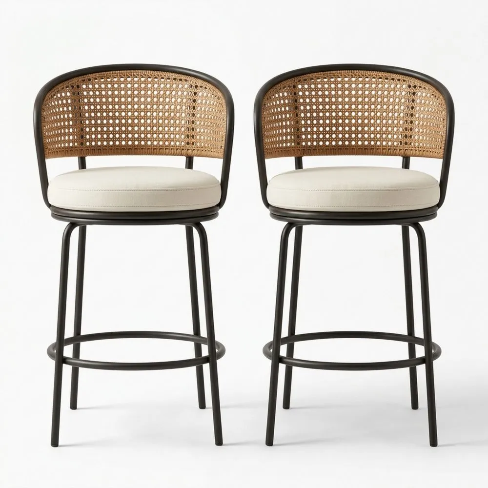 2er-Set Barhocker Stahl Polyethylen-Rattan-Rückenlehne Leinen Beige