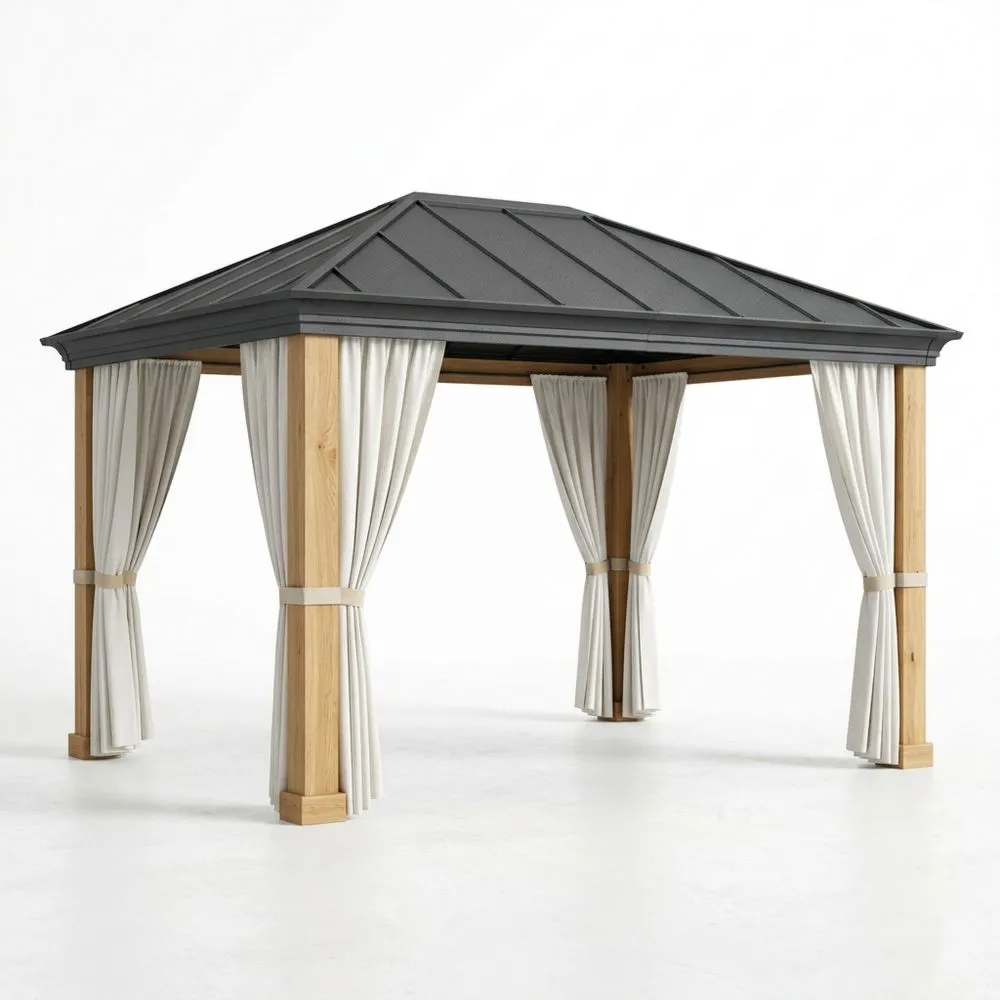 Pavillon Stahl Massivholzrahmen Creme Polyester Vorhänge